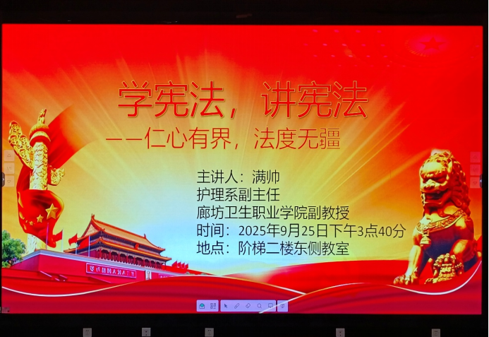 为进一步增强护理系学生的法治观念,推进依法治教、依法治学,营造安全、文明、和谐的校园环境,护理系于2025年9月25日在阶梯教室二楼东侧开展“仁心有界,法度无疆”主题法制讲座。本次讲座由护理系副主任满帅主讲。