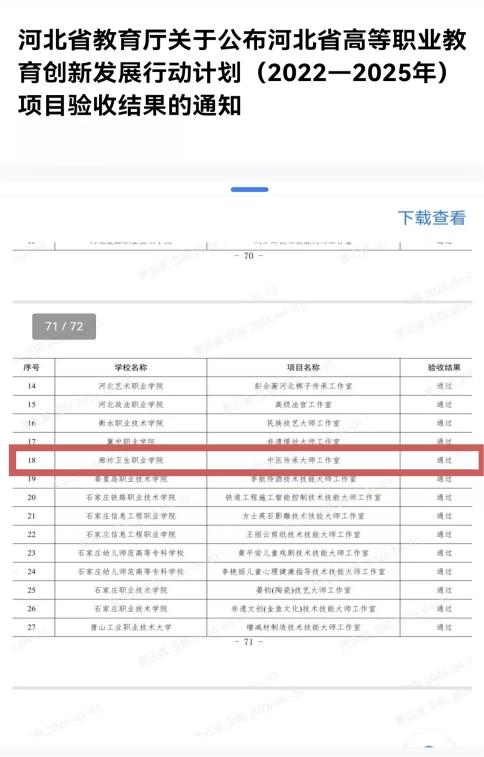 根据《河北省教育厅关于开展高等职业教育创新发展行动计划(2022-2025年)项目申报工作的通知》,廊坊卫生职业学院积极响应省里号召组织项目申报。经学院申报、数据审核、专家评审和结果公示等环节,临床医学系贾云波老师负责的《中医传承大师工作室》和马杰老师负责的在线课程《健康评估》两个项目成功入选。