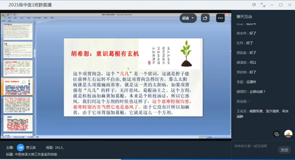 姚颖玉主任讲授了四类常用的中成药---葛根汤颗粒、小柴胡颗粒、麻子仁丸、六味地黄丸,结合中医的经典巨著《伤寒杂病论》的原文,剖析原文含义,结合自身的临床经验及经典案例,对四类常用中成药进行了深刻透彻的解析。部分问题与同学们积极互动,增强了学生对中医经典巨著的了解,加深了理论学习,同时提升了临床认知水平,大家普遍感觉收获颇丰。