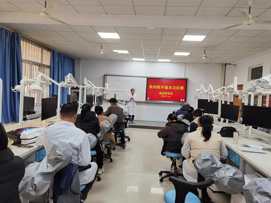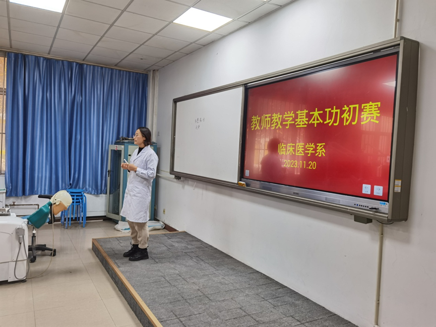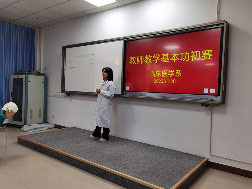 学院为了进一步提高教师教学基本技能,促进教师树立高职教育理念,磨练教学内功,优化整体素质,提升教学质量,组织全院青年教师开展教学基本功比赛。临床医学系为了响应学院安排,实现“以赛促训、以培促学”的目的,于2023年11月20日下午在2号实验楼104室顺利举办临床医学系教师教学基本功初赛,临床医学系书记黄志强同志出席此次比赛。比赛由教学科科长杨立彬主持,比赛评委由系书记黄志强、教学科科长杨立彬、妇产科教研室主任朱慧芳、中医教研室主任吕桂凤、外科教研室主任么金平担任。