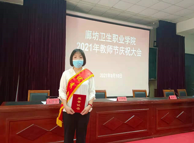 9月10日上午,廊坊卫生职业学院2021年度教师节庆祝大会在学术报告厅隆重举行,我部教师王芳倩获得优秀教师称号。在此向她本人致以热烈的祝贺,希望以此为契机,再接再厉,再创佳绩,为部门创新为学校发展做出更大的贡献!