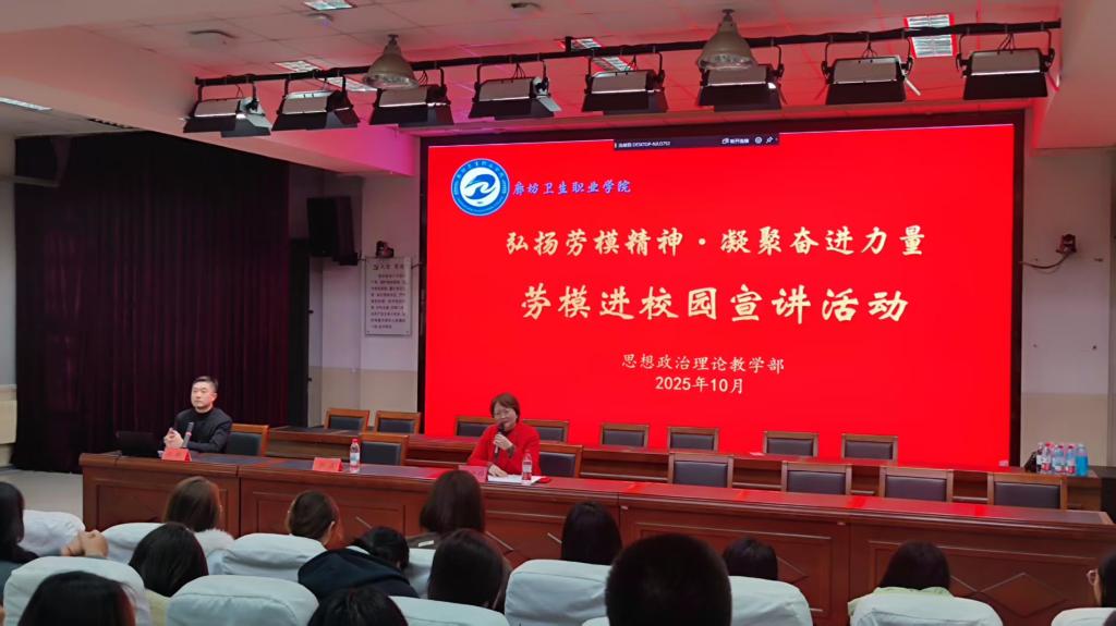 为深入贯彻落实党的教育方针,切实推进“立德树人”根本任务,创新思政育人模式,2025年10月23日下午,由思想政治理论教学部主办、“劳-创”双育名师工作室承办的“弘扬劳模精神 凝聚奋进力量”劳模进校园活动在阶梯楼学术报告厅成功举行。本次活动作为“劳-创”双育名师工作室立项后的首场大型系列活动,旨在通过劳动模范的示范引领,探索劳动教育与创新教育深度融合的新路径,为培养新时代高素质卫生人才注入强大精神动力。