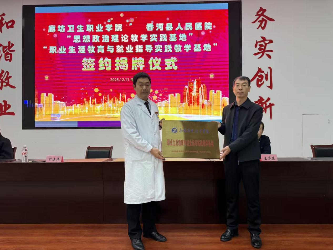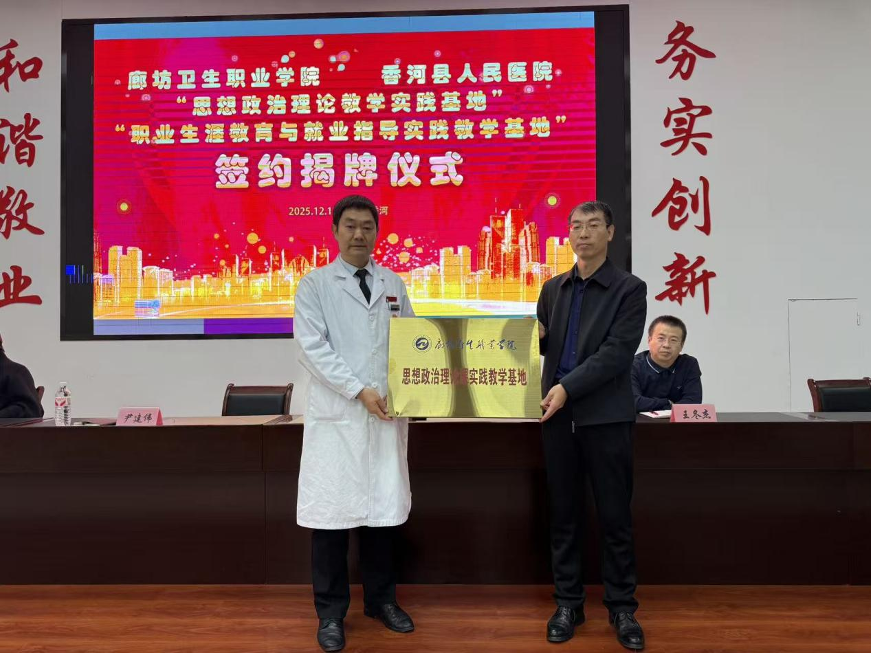 为深化校院协同育人机制,推动医学教育与思政育人深度融合,2025年12月11日,廊坊卫生职业学院与香河县人民医院在香河县人民医院多功能厅举办共建实践教学基地揭牌仪式暨“医校携手医路领航,德技并修赋能成长”主题活动。学院党委委员、副院长纪连永出席仪式并致辞,思政部、教务处负责人、思政教师代表、学生代表参加活动。香河县人民医院副院长尹建伟致欢迎词,医务处主任孙长星、内科副主任、主任医师杨士春现场为师生进行职业精神职业素养教育宣讲,为学生职业发展进行指导。
