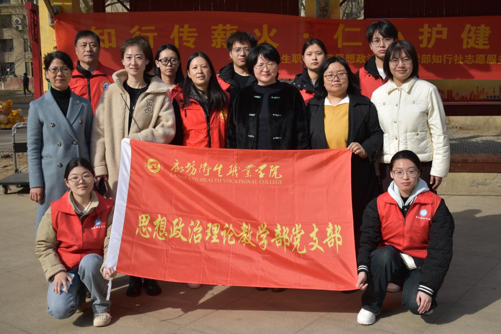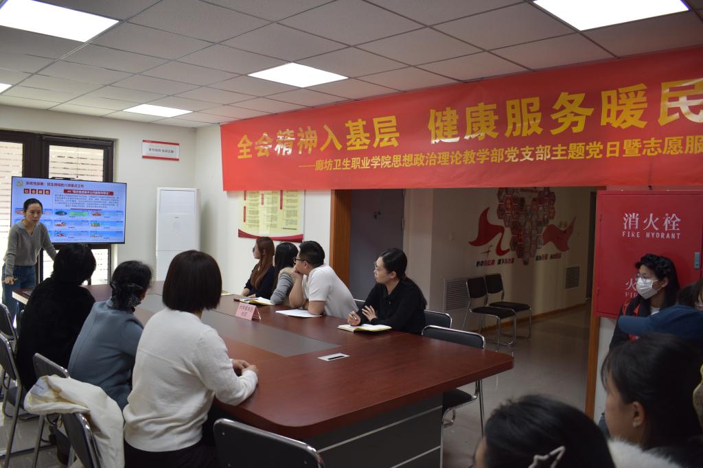 为深入学习贯彻全会精神,牢固树立和践行正确政绩观,推动党建工作与社区服务、实践育人深度融合,切实将党的创新理论落到基层、把暖心服务送到群众身边。3月19日下午,廊坊卫生职业学院思政部党支部走进大学里社区党群服务中心,开展“全会精神进基层 健康服务暖民心”主题党日活动。活动紧密结合理论宣讲、健康服务、环境整治与学雷锋志愿服务,以务实举措践行初心使命,彰显责任担当。