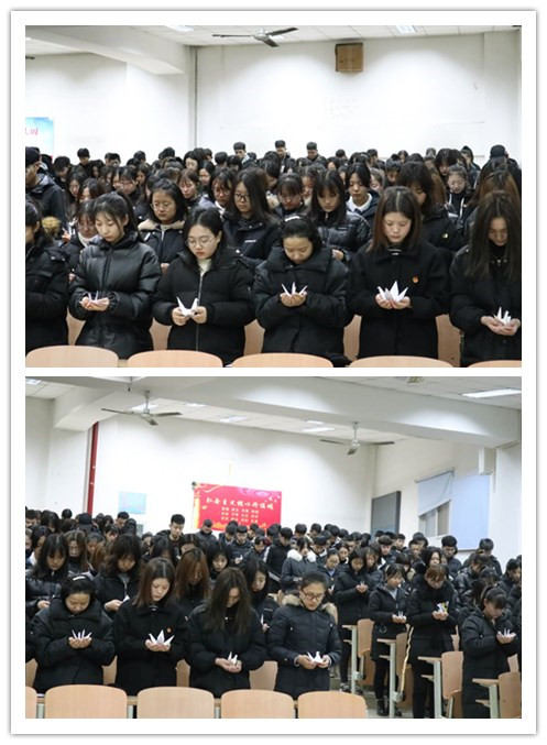 全场同学手捧千纸鹤,为南京大屠杀死难者默哀。