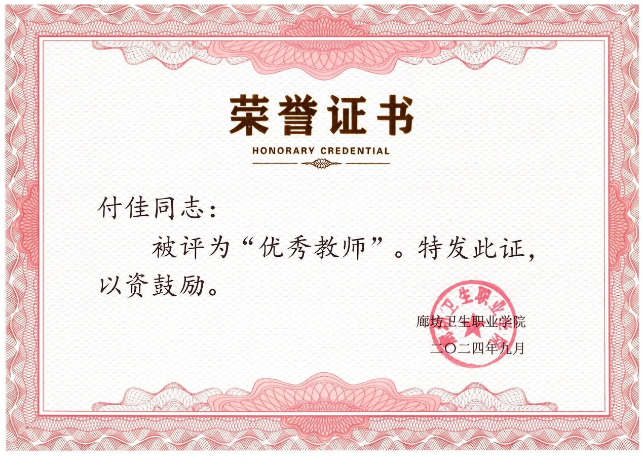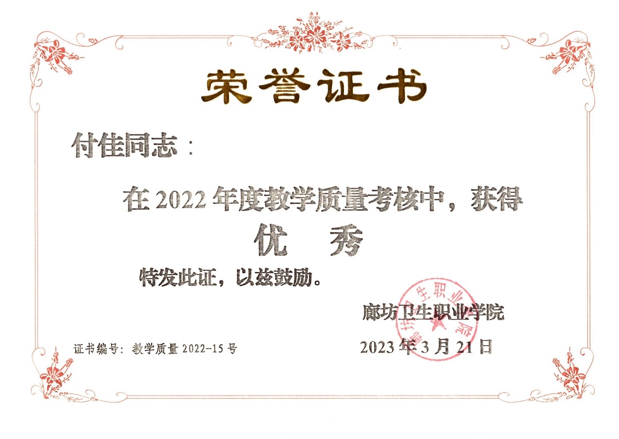 2022年,教学质量考核优秀。2023年参加第二届全国职业院校检验科普作品大赛(教师组)荣获二等奖;2023年指导学生参与第二届全国职业院校检验科普作品大赛(学生组)荣获二等奖;2023年指导学生参与河北省职业院校技能大赛(高职)检验检疫技术比赛荣获三等奖;2024年指导学生参与第七届全国职业院校检验专业微课大赛(学生组)荣获三等奖;2024年指导学生参加河北省职业院校技能大赛(高职)检验检疫技术比赛荣获二等奖。2024年指导学生参加一带一路暨金砖国家技能发展与技术创新大赛医学实验诊断职业技能赛项荣获三等奖。