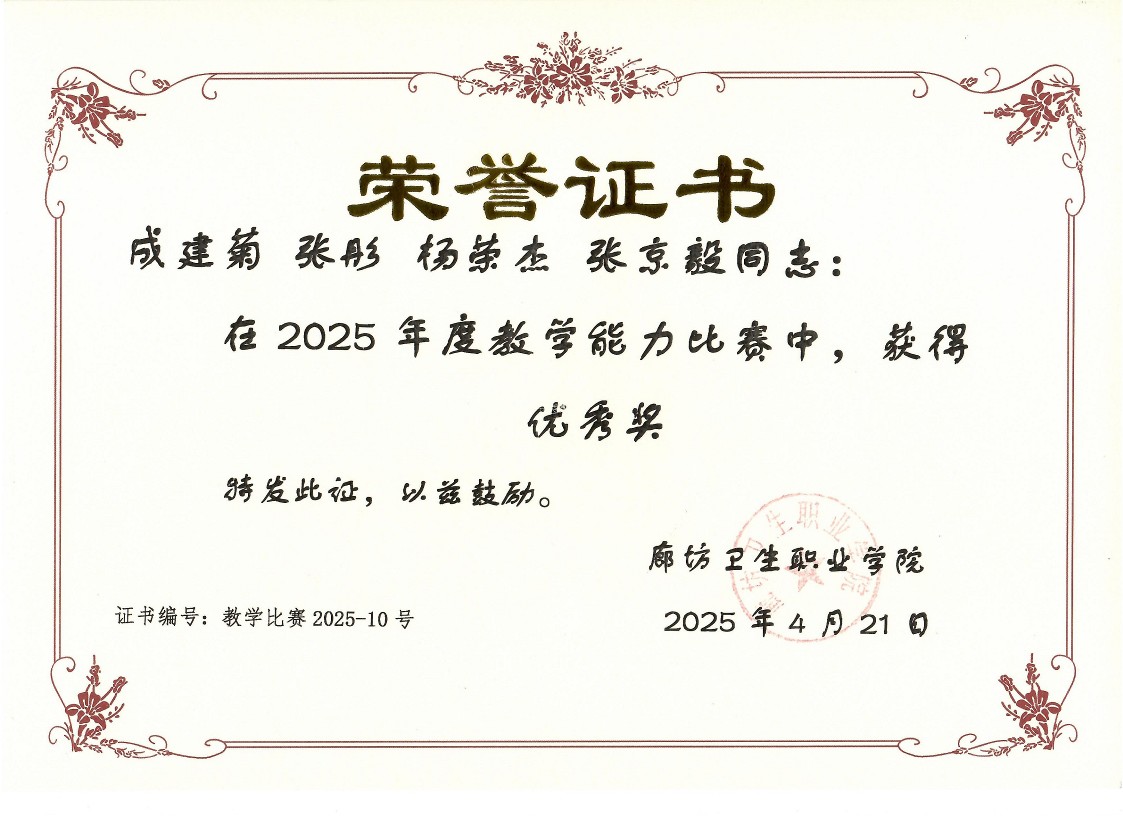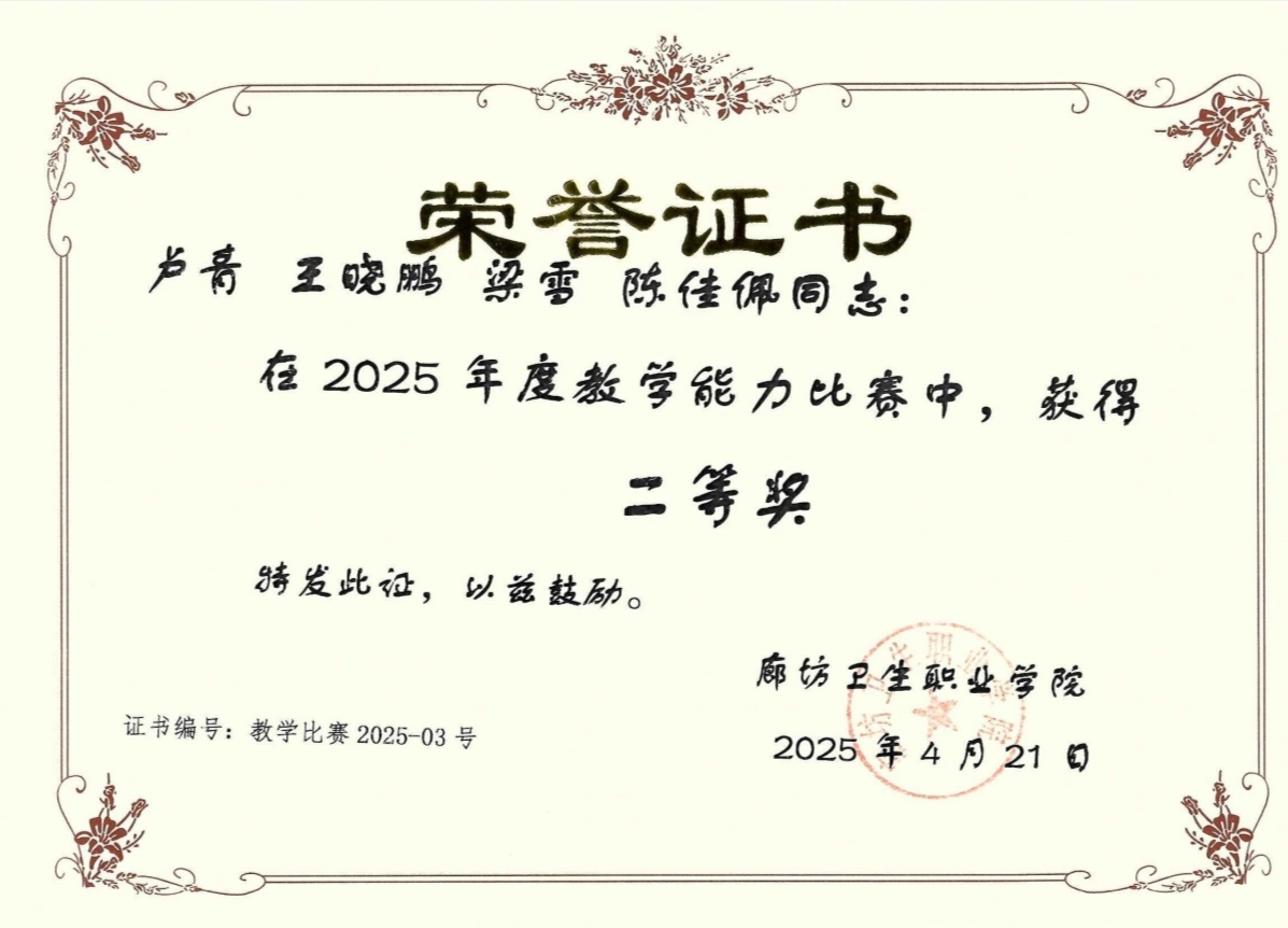 此次获奖,是公共基础部始终坚持以教学质量为根本、注重教师队伍建设、不断深入推进教育教学改革的成果体现。我部将始终秉持“以赛促教、以赛促学、以赛促改、以赛促建”的理念,进一步加强对教师教学能力的培育力度,激励更多教师投身于教学研究与实践当中,持续提升教师的整体教学水平和核心竞争力。公共基础部也将把此次获奖当作契机,进一步探寻职业教育发展的崭新路径与模式,不断提高教育教学质量和人才培养水平,为培养更多高素质技能人才、服务地方医学发展添砖加瓦、再谱新篇。