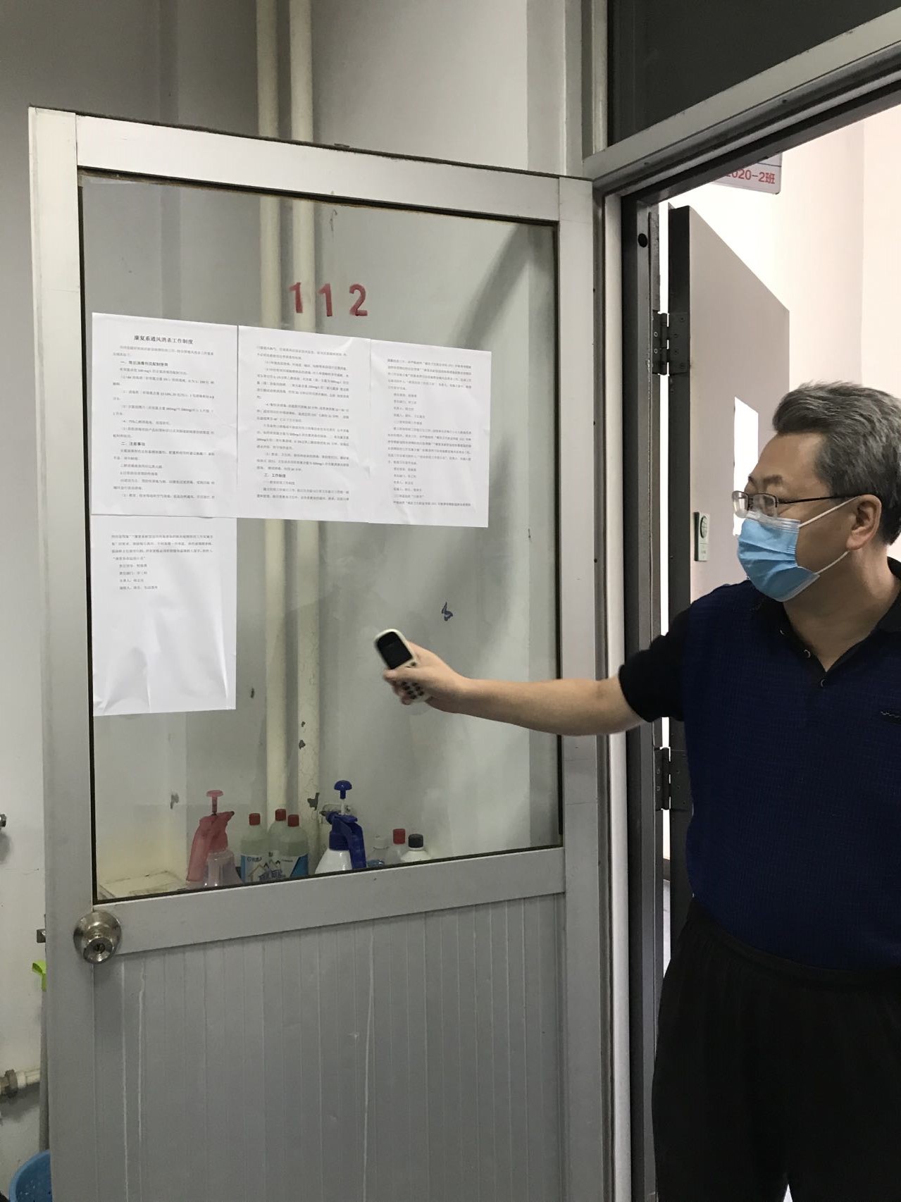 程书记首先详细询问了学生教室和宿舍消毒、通风、戴口罩和日测体温的情况;仔细检查了防控物品和教室防疫工作值日表、宿舍防疫工作值日表、每周班级晨午晚体温检测登记表;反复叮嘱学生一定要按照教室门上张贴的消杀工作制度和日常防控条例认真做好消杀工作、规范佩戴口罩、每日按时测量体温并如实上报。