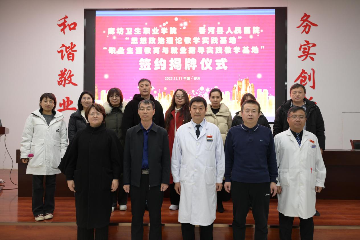 为深化校院协同育人机制,推动医学教育与思政育人深度融合,2025年12月11日,廊坊卫生职业学院与香河县人民医院在香河县人民医院多功能厅举办共建实践教学基地揭牌仪式暨“医校携手医路领航,德技并修赋能成长”主题活动。学院党委委员、副院长纪连永出席仪式并致辞,思政部、教务处负责人、思政教师代表、学生代表参加活动。香河县人民医院副院长尹建伟致欢迎词,医务处主任孙长星、内科副主任、主任医师杨士春现场为师生进行职业精神职业素养教育宣讲,为学生职业发展进行指导。