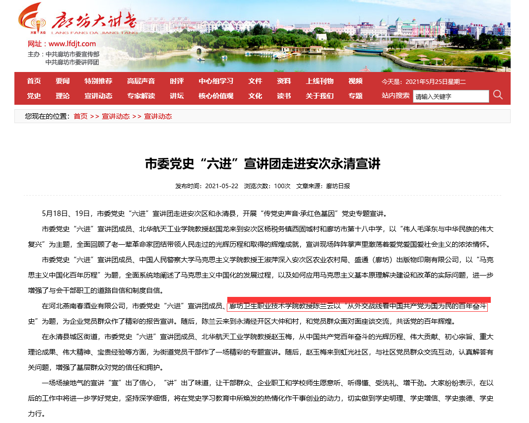 5月19日,我院思政部教研室主任、市委党史“六进”宣讲团成员陈兰云教授,走进永清县,开展“传党史声音·承红色基因”党史专题宣讲。